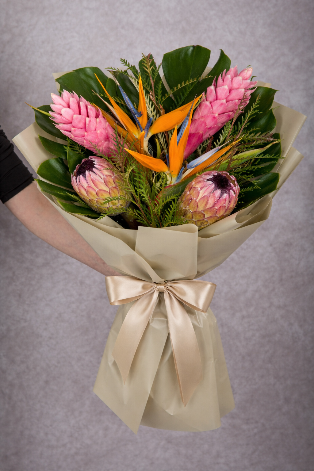 Flowers included: Proteas Birds of Paradise Gingers Grevilleas Monstera Leaves